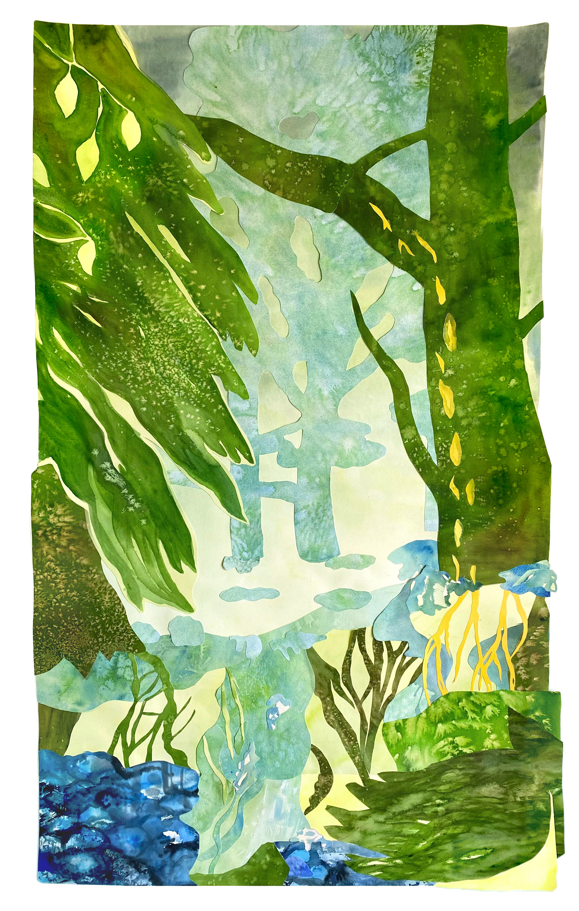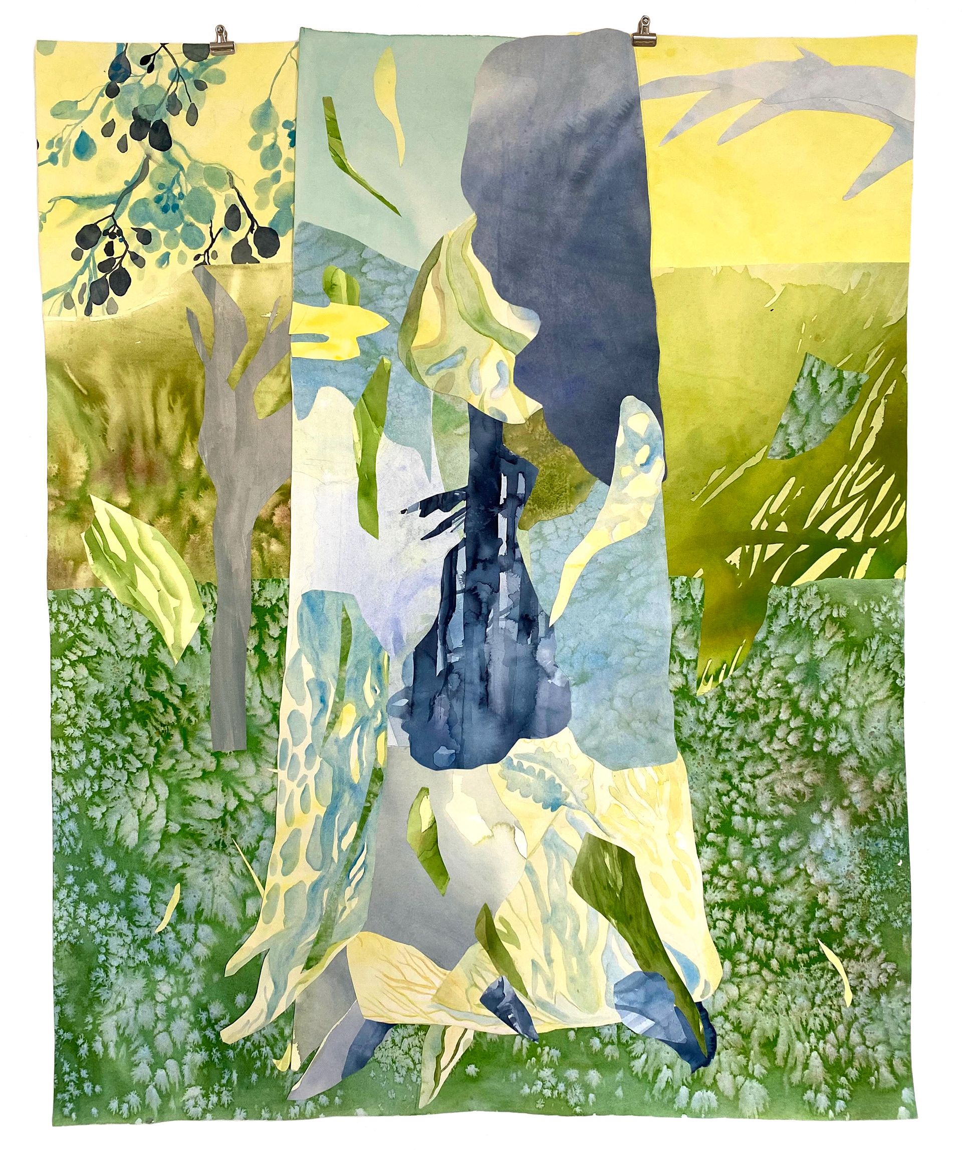 Collage av akvarell på papper. "Rötter" 165 x 96 cm "Stammen" 137 x 109 cm