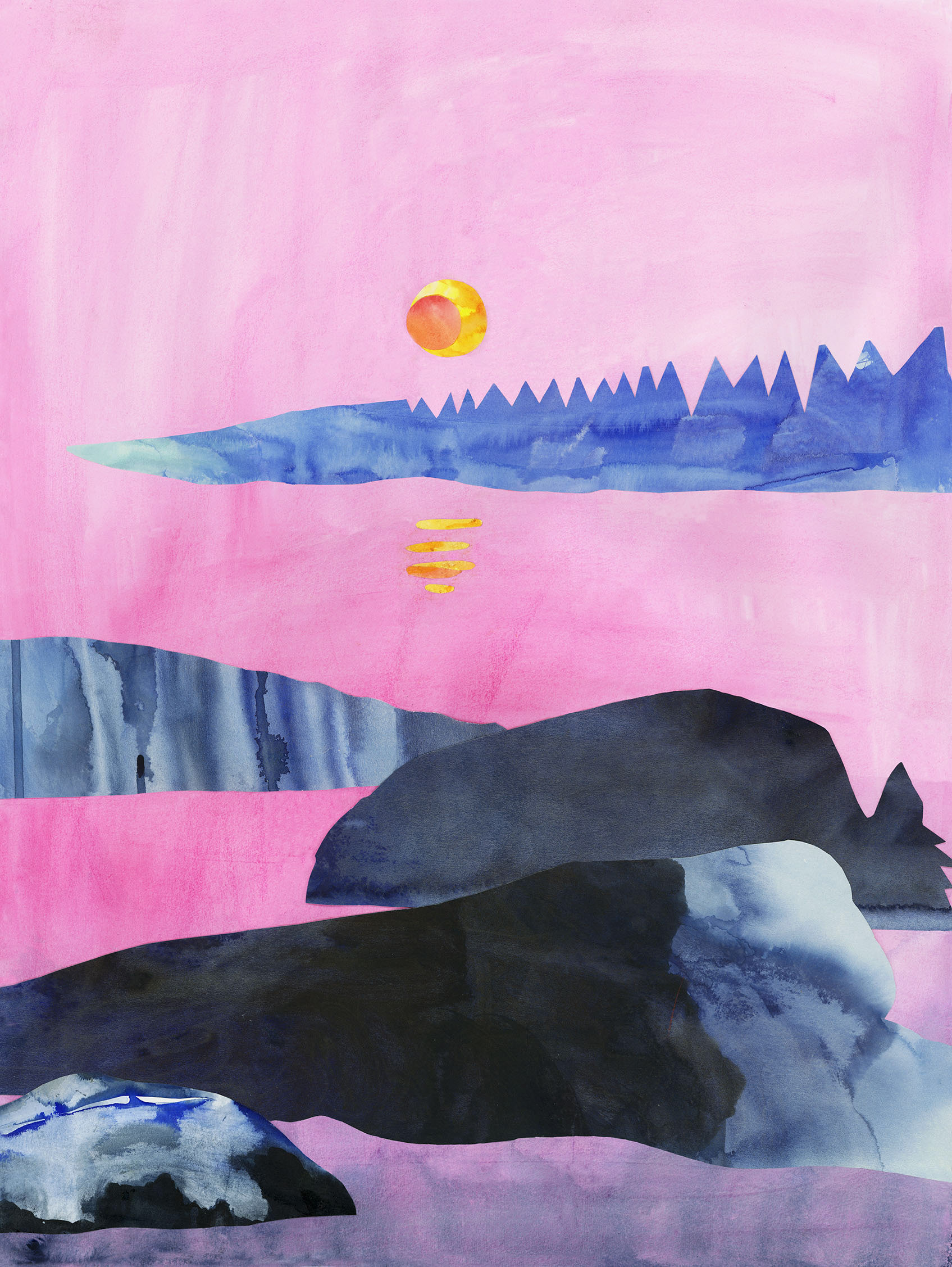 "Rosa Landskap" akvarell och kollage 50X70 cm och "Gul Sol" akvarell och kollage 40X30 cm. "Rosa Landskap" finns som poster på Batikhäxan och Moderna Museets Butik. Original såld via Aftonbladets konstförening.