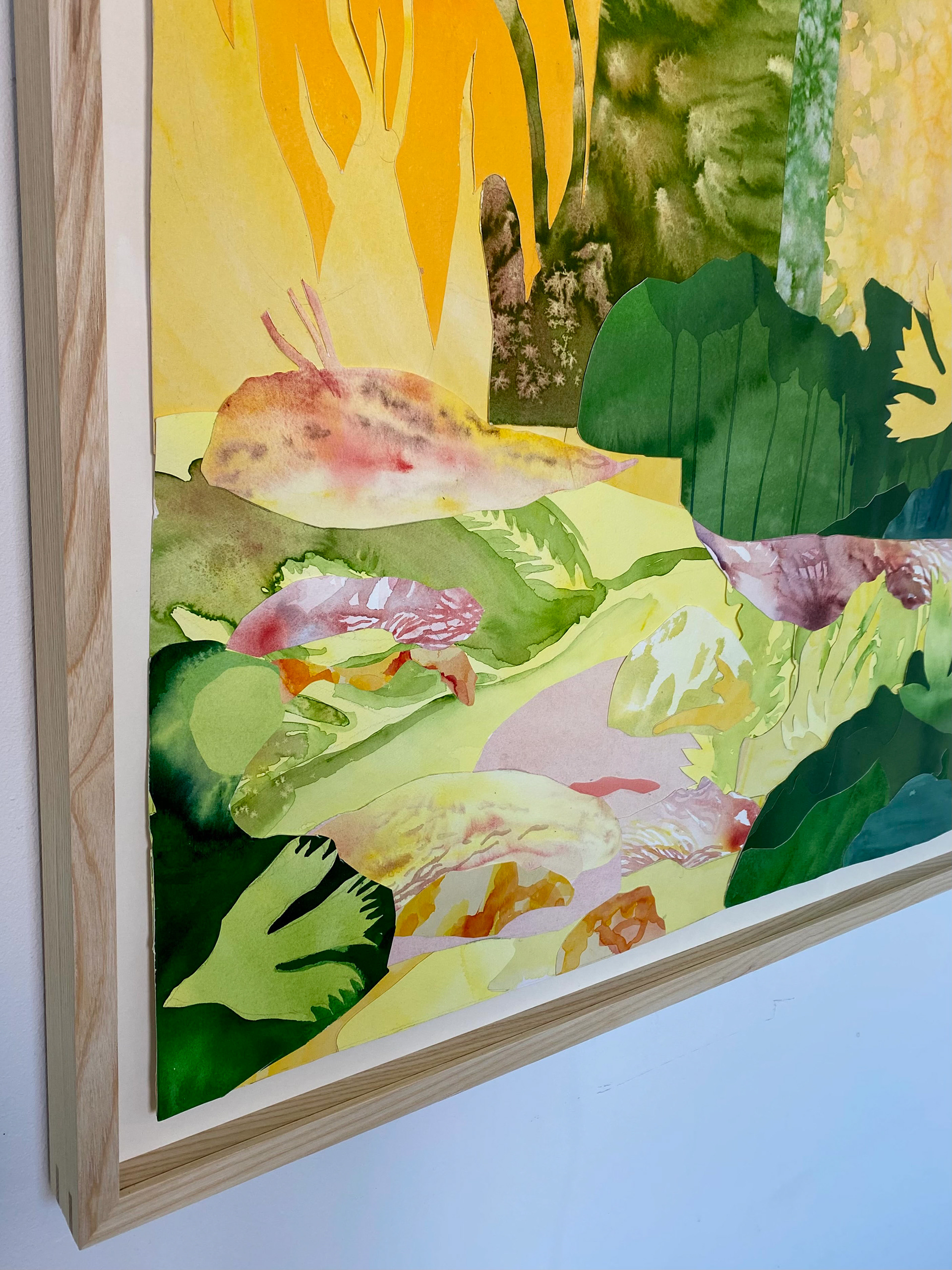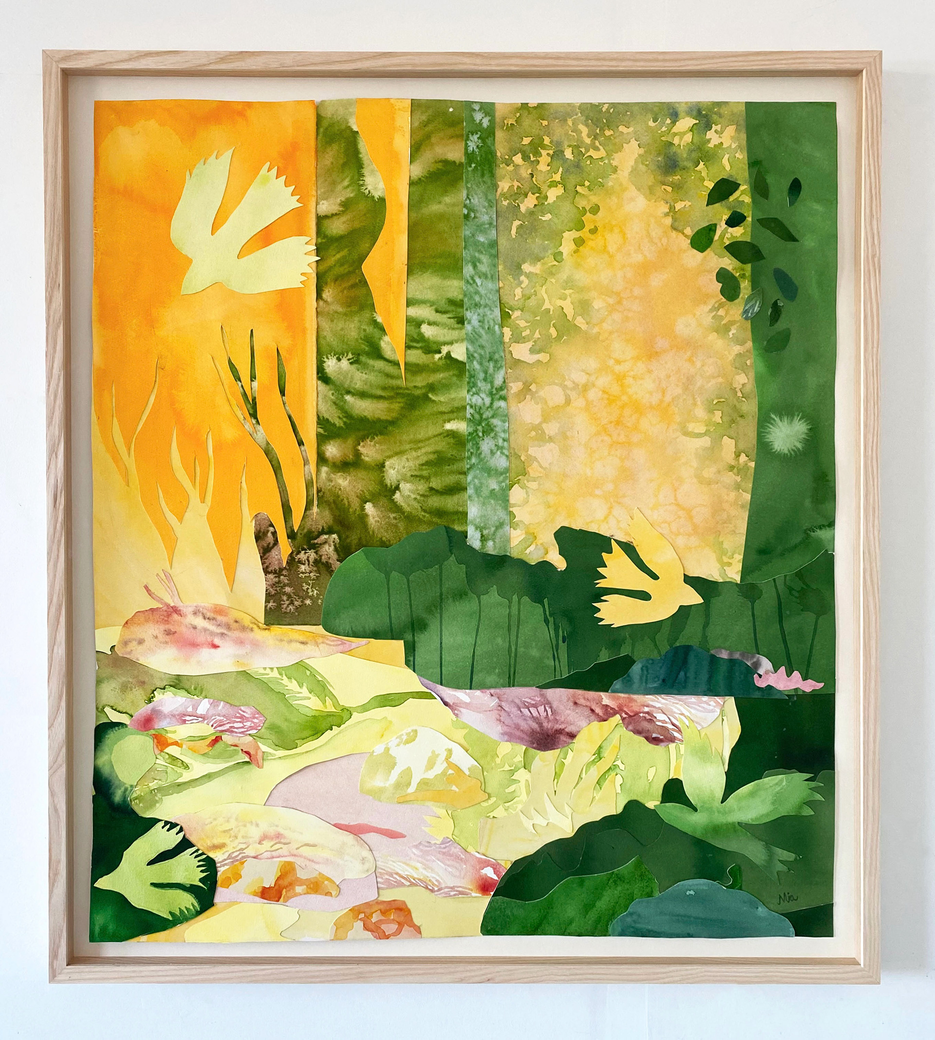”Ljom” Collage av akvarell. 85 x 76,5 cm. Utgångspunkten till detta verk var en myr. Jag blev inspirerad av det varma solljuset, fåglarna och hur hela naturen runt myren förmedlade en känsla av rörelse. Bilden har använts som skivomslag till det norsk/svenska folkmusikbandet Ljom. Originalet visades på Galleri Borgenhag Holmqvist i Eskilstuna 2025. Uppköpt av Arboga Kommun för placering på LSS boende.